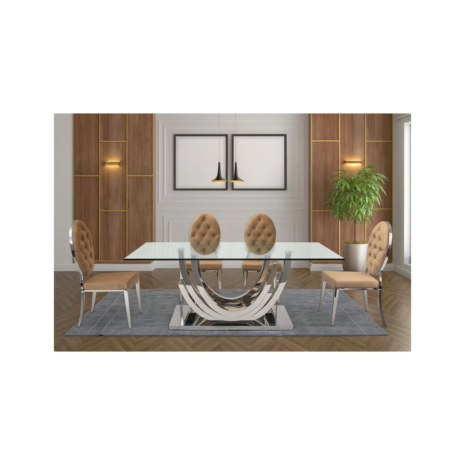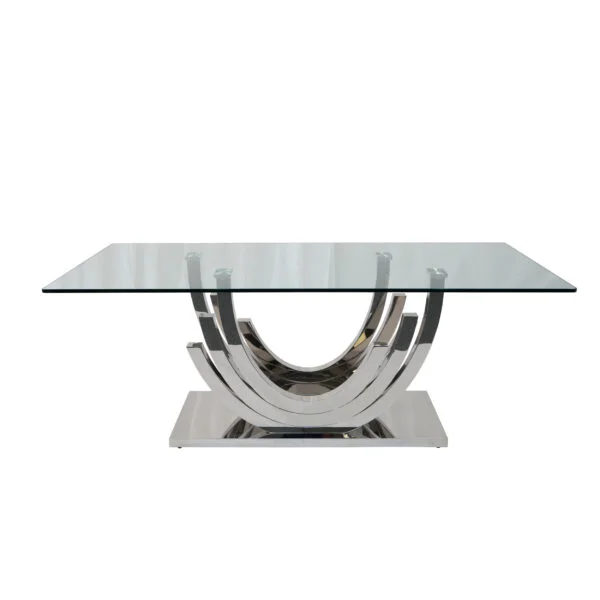 This table features a 15mm thick clear tempered glass top with safety-minded rounded corners, two crescent-shaped pedestals and a platform base crafted in polished silver stainless-steel.